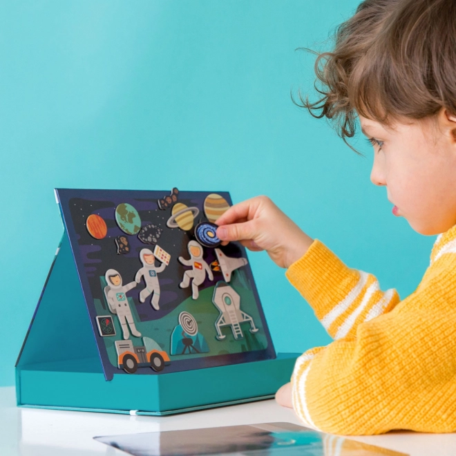 Odkryj kreatywny świat z magnetycznym teatrzykiem o tematyce kosmicznej, który oferuje dzieciom dwa tła i ponad 50 magnetycznych elementów do tworzenia własnych opowieści. Przenośny zestaw do zabawy ze sprytnym pudełkiem w formie stojaka, szybkie sprzątanie dzięki elastycznej gumce oraz solidna, ekologiczna konstrukcja z materiałów z recyklingu gwarantują długą zabawę w domu i w podróży.