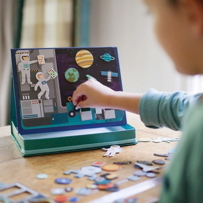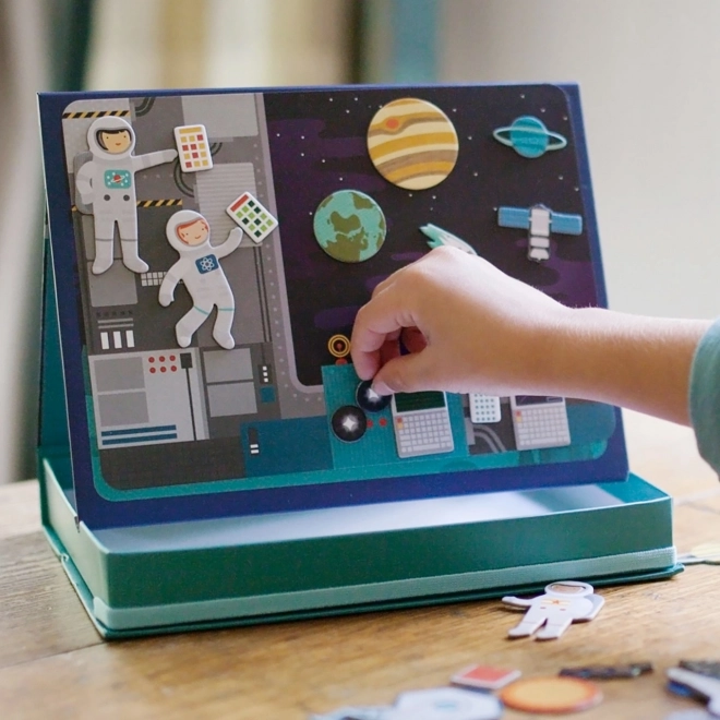 Magnetyczne teatrzyki kosmiczne oferują dzieciom nieskończone możliwości łączenia elementów i tworzenia scen na dwóch magnetycznych tłach – w przestrzeni kosmicznej i na stacji kosmicznej. Dzięki ponad 50 magnetycznym częściom mali odkrywcy mogą tworzyć oryginalne historie, rozwijać wyobraźnię i małą motorykę. Praktyczne pudełko ze stojakiem i blokadami umożliwia łatwe ustawienie sceny w dowolnym miejscu.