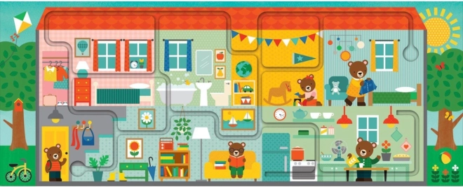 Ten kreatywny zestaw PETIT COLLAGE łączy puzzle i interaktywny labirynt w jedną grę, która bawi i uczy. Po ułożeniu 10 dużych elementów powstaje długi obraz domu (53 × 21,5 cm), w którym dzieci palcem śledzą wyznaczoną trasę i jednocześnie odkrywają 20 ukrytych przedmiotów.
