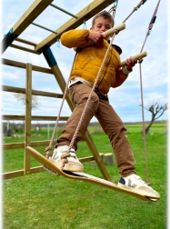 Ta nietypowa huśtawka łączy zabawę z rozwojem motoryki. Deska z mocnej sklejki z podgiętymi krawędziami oraz regulowane uchwyty z litego drewna pozwalają dzieciom bezpiecznie trenować równowagę, koordynację i stabilność. Dzięki powierzchni antypoślizgowej huśtanie na stojąco jest pewniejsze i wygodniejsze.