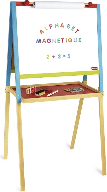 Wspieraj kreatywność dzieci dzięki tej stabilnej, drewnianej tablicy 2 w 1. Oferuje czarną powierzchnię do kredy i białą magnetyczną powierzchnię do markerów, uchwyt na rolkę papieru, dużą półkę odkładczą oraz bogaty zestaw akcesoriów. Wyprodukowano we Francji z litego drewna, z wykończeniem na bazie wody – bezpieczne i trwałe rozwiązanie do codziennego tworzenia.