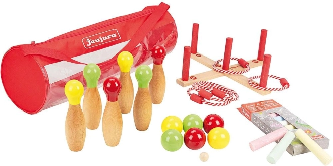 Zestaw gier zewnętrznych Jeujura jest idealny dla każdego dziecięcego placu zabaw. W tym praktycznym zestawie znajdziesz wszystko, co potrzebne do zabawnych gier jak klasy czy kręgle. Wszystko wykonane z wysokiej jakości drewna i farb wodnych, zapewniających bezpieczeństwo i trwałość.