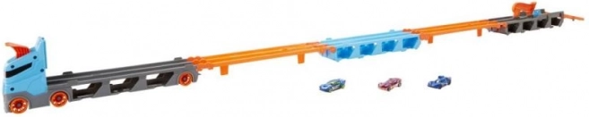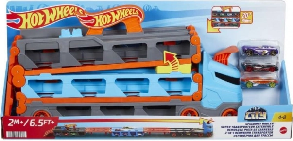 Z wyścigowym transporterem 2 w 1 od Hot Wheels możesz łatwo przechowywać i prezentować do 20 autek dzięki małym okienkom w naczepie. Gdy nadchodzi czas na wyścig, po rozłożeniu transporter zamienia się w tor wyścigowy o długości 1,8 metra. Pojazdy pozostają widoczne pod torem, a kabina ciężarówki przemienia się w podwójną wyrzutnię dla dwóch samochodów.