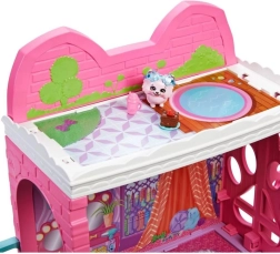 Odkryj wielkomiejską przygodę z domkiem ENCHANTIMALS, który oferuje aż 6 stref zabawy w jednym stylowym secie. Dzieci mogą obsługiwać gości w przytulnej kawiarni z patio, zrelaksować się w salonie z kuchnią, położyć lalkę spać w sypialni i skorzystać z atrakcji basenu na dachu. Realistyczne elementy, takie jak balkon, zewnętrzna klatka schodowa oraz otwierane drzwi z klapką dla pieska Pommy, wspierają odgrywanie ról i rozwój wyobraźni.