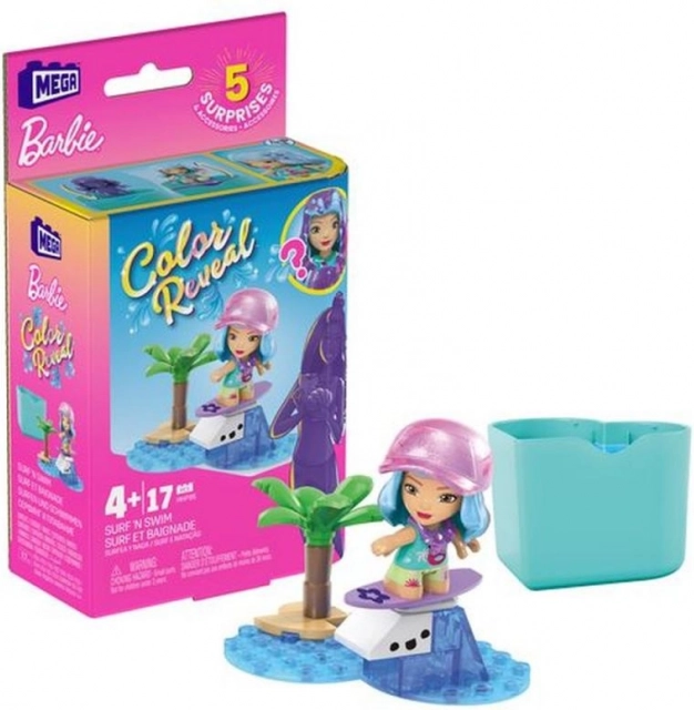 Zestaw konstrukcyjny Mega Construx Barbie Color Reveal oferuje unikalne doświadczenie pełne niespodzianek, które zaczyna się od otwarcia opakowania w kształcie serca. W środku znajdziesz dwie saszetki, które zawierają: