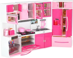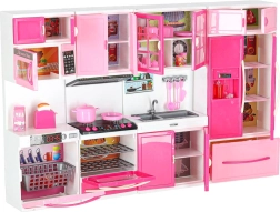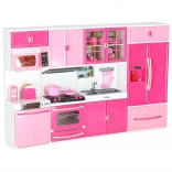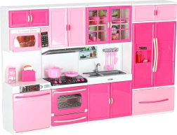 Zestaw obejmuje mikrofalówkę i zmywarkę, kuchenkę z piekarnikiem, witrynkę ze zlewem oraz lodówkę z szufladą. Dzieci cieszą się kompletnym scenariuszem gotowania, pieczenia i sprzątania.
