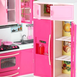Ta nowoczesna kuchnia dla lalek wprowadza dzieci w świat fantazji i naśladowania codziennych czynności. Cztery połączone segmenty pozwalają zbudować kompletną kuchnię ze wszystkimi ważnymi elementami – od kuchenki z piekarnikiem po lodówkę i zlew. Podświetlane palniki LED i dźwięki nadają zabawie w gotowanie realistyczny charakter.