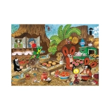 Wesoła ilustracja z Krecikiem i jego przyjaciółmi w kuchni jest pełna detali, które bawią dzieci i rozwijają ich wyobraźnię.