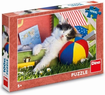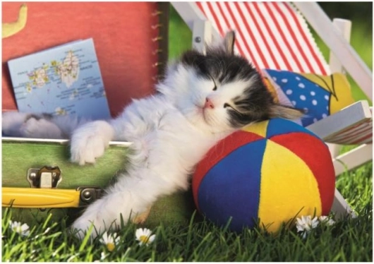 Kolorowy obrazek śpiącego kociątka z piłką motywuje dzieci do układania i zdobi każdy dziecięcy pokój.