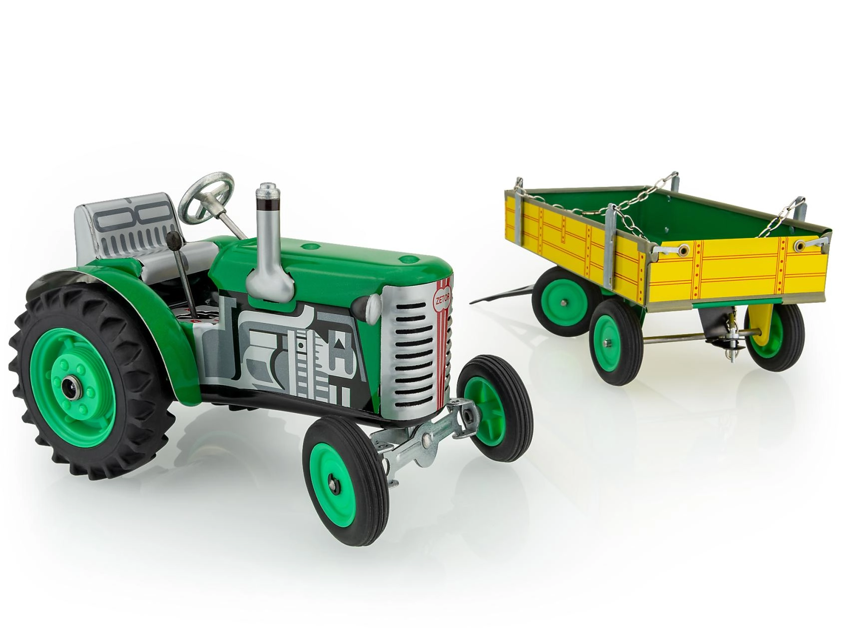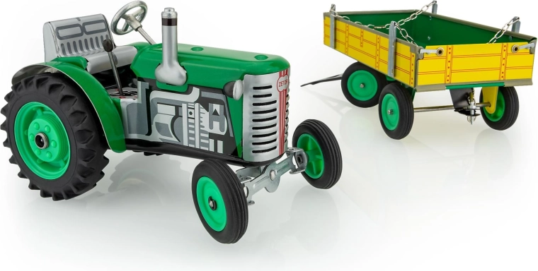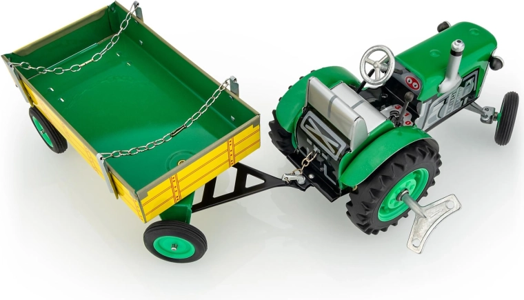 Metalowy traktor Zetor z przyczepą marki KOVAP ucieszy małych i dużych fanów techniki rolniczej. Napęd zapewnia sprężynowy mechanizm na kluczyk, nie brakuje funkcjonalnej skrzyni biegów z 3 prędkościami do przodu i biegiem wstecznym, kierowania kołem ani hamulca ręcznego. W skali 1:25 i długości 28 cm oferuje autentyczne wrażenia z jazdy oraz wartość kolekcjonerską.