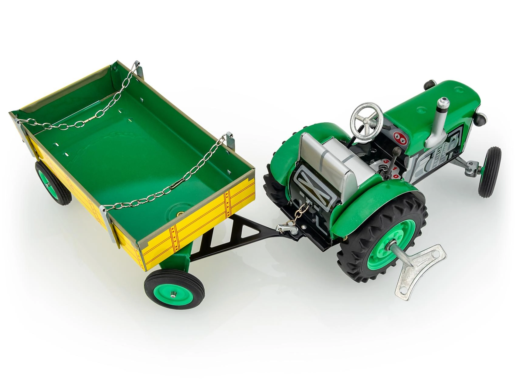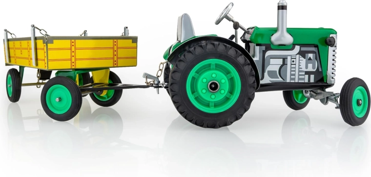 Odkryj solidny czeski model traktora Zetor z przyczepą, wykonany z metalu z dbałością o detale i trwałość. Dzięki sprężynowemu mechanizmowi na kluczyk traktor naprawdę rusza, a funkcjonalna skrzynia biegów pozwala wybrać trzy prędkości do przodu oraz bieg wsteczny. Dzieci mogą sterować traktorem za pomocą kierownicy i bezpiecznie zatrzymać go przy użyciu hamulca ręcznego.
