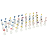 50 szt. znaków drogowych (karton, wysokość ok. 5 cm), 50 szt. plastikowych podstawek, opisy znaczeń znaków w języku czeskim i słowackim
