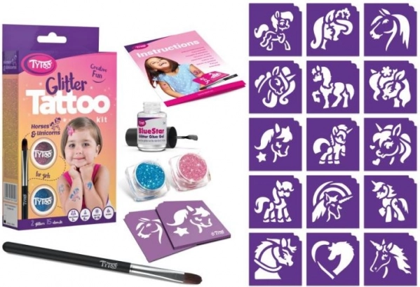 Ciesz się magią błyszczących tatuaży z pięknymi motywami koni, kucyków i jednorożców dzięki zestawowi TyToo. Wykorzystaj unikalne wzory, które utrzymują się na skórze do 18 dni, w zależności od typu Twojej skóry i staranności podczas używania. Większe zestawy zawierają ruchome oczy i samoprzylepne kamienie, które możesz przykleić na skórze, tworząc tym samym wyjątkowy wzór.