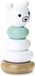 Ta elegancka wieża do nakładania z misiem w biało–miętowej kombinacji i naturalnym drewnianym wykończeniu to idealna pierwsza edukacyjna zabawka. Dzieci ćwiczą prawidłowe układanie krążków, rozróżnianie rozmiarów i rytm ruchów, a stonowane kolory i uroczy wyraz misia pobudzają ciekawość i sprzyjają spokojnej zabawie.