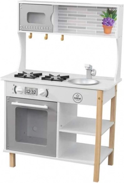 Stylowa drewniana kuchnia KidKraft zamieni pokój dziecka w małe bistro. Oferuje realistyczne, obrotowe pokrętła z przyjemnym kliknięciem, otwierane drzwiczki piekarnika i kuchenki mikrofalowej oraz 38 szt. akcesoriów. Dzięki wyjmowanemu zlewozmywakowi dla łatwego czyszczenia, półkom i haczykom wszystko ma swoje miejsce. Odpowiednia od 3 lat. Wymiary 59,9 × 34,29 × 90 cm.