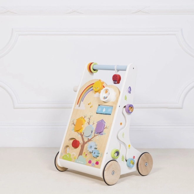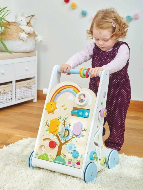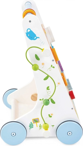 Drewniany chodzik z aktywnościami został zaprojektowany tak, aby był nie tylko zabawny, ale także edukacyjny. Dzięki niemu dzieci uczą się chodzić i rozwijają swoje umiejętności sensoryczne.