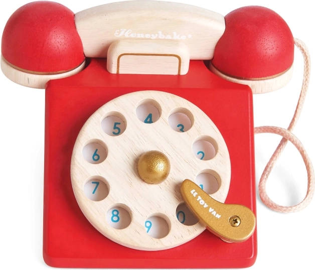 Odkryj urok klasycznego telefonu w wersji dla dzieci. Ten drewniany retro telefon od LE TOY VAN z kolekcji Honeybake zachwyca intensywnie czerwonym kolorem, naturalnymi detalami oraz realistycznymi elementami, takimi jak obrotowa tarcza i dzwonek w słuchawce. Zabawka jest ręcznie domalowana ekologicznymi farbami i zaprojektowana tak, by służyć przez długi czas.
