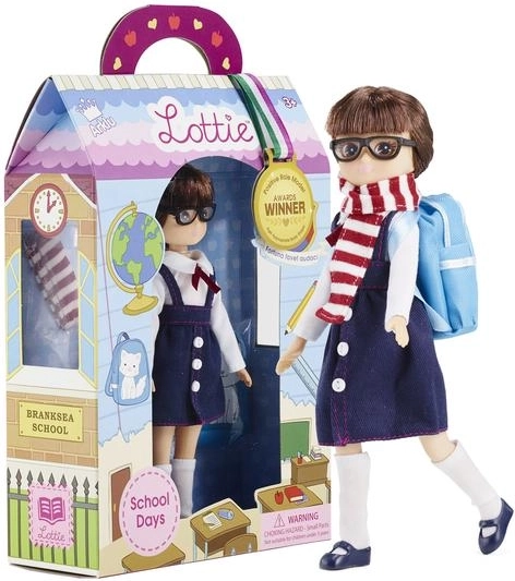 Artykułowana lalka Lottie uczennica z plecakiem, okularami i kartami z poradami dotyczącymi przywództwa inspiruje dzieci do twórczej zabawy oraz rozwija współpracę, empatię i pewność siebie. Stoi samodzielnie i ma zdejmowane buty.