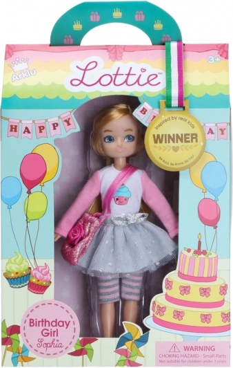 Lottie Birthday Girl Sophia wnosi radość urodzin każdego dnia. Ma różową koszulkę z nadrukiem babeczki, srebrną spódnicę i paskowane legginsy/krótkie spodenki, które dopełniają srebrne tenisówki i błyszcząca różowa torebka. Lalka ma zginane kolana, stoi samodzielnie, a jej premium nylonowe włosy są miękkie i nie plączą się.
