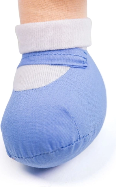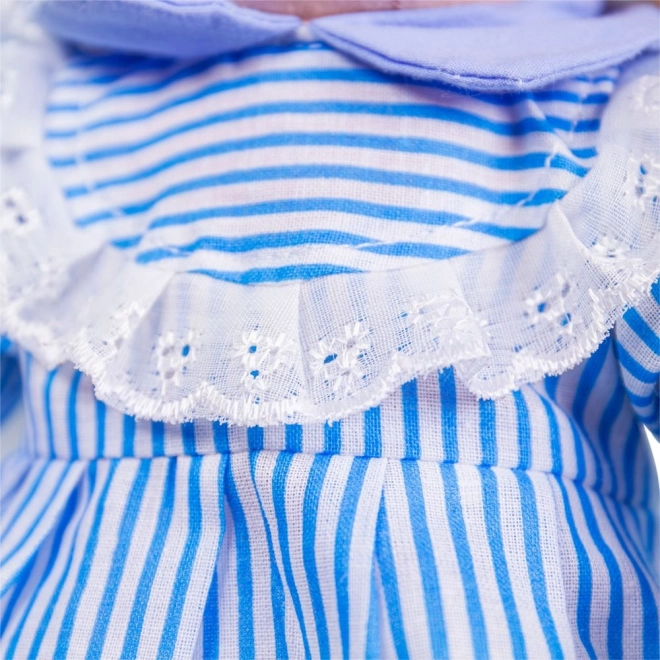 Amelia to miękka, szmaciana lalka z brązowymi warkoczykami z przędzy, niebiesko‑białą prążkowaną sukienką i przyjaznym uśmiechem. Została zaprojektowana do bezpiecznego przytulania od pierwszych dni, wspiera rozwój małej motoryki i empatii oraz świetnie nadaje się do pierwszych zabaw w opiekę.