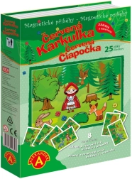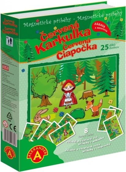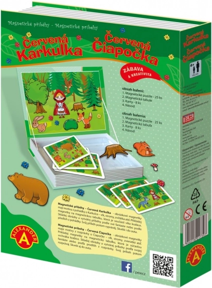 Odkryj zabawny świat magnetycznych opowieści z motywem Czerwonego Kapturka. Dzieci układają obrazkowe magnesy na magnetycznym tle według wzorów na kartach lub tworzą własne kombinacje i historie. Gra działa również jak mały magnetyczny teatrzyk, który naturalnie rozwija fantazję i umiejętności komunikacyjne.