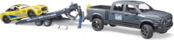- Terenowy pick-up RAM, przyczepa, żółty samochód sportowy, figurka kierowcy, dodatkowa kierownica