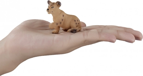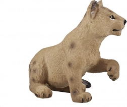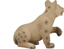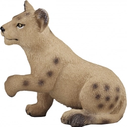 Figurka przedstawia lwiątko w naturalnej pozie z delikatną fakturą futra i autentycznymi cętkami typowymi dla młodych osobników.