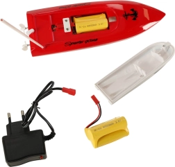 łódź, pilot zdalnego sterowania, akumulator 3,6 V, ładowarka sieciowa, antena, instrukcja