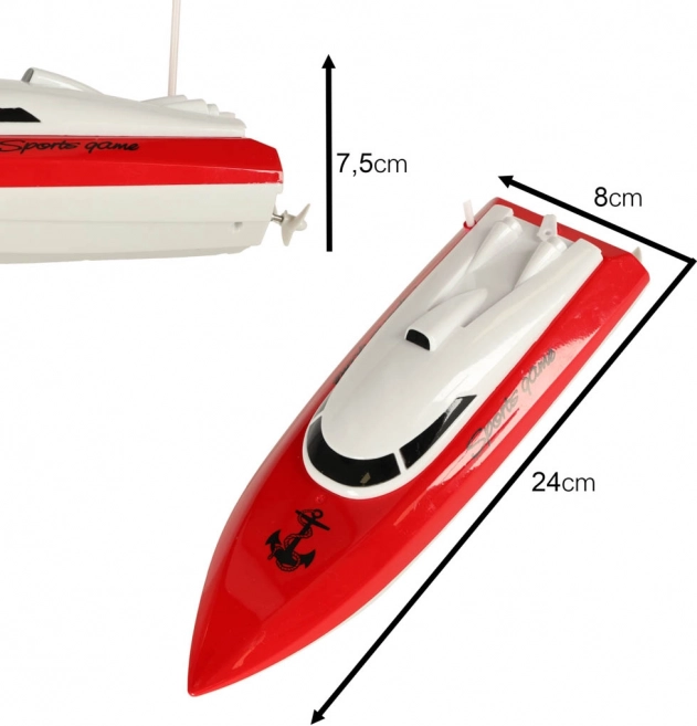 W zestawie znajduje się wszystko, co potrzebne do uruchomienia: łódź, pilot zdalnego sterowania, ładowarka sieciowa, akumulator oraz antena. Pilot wygodnie leży w dłoni i do pracy wymaga 2× AA 1,5 V (brak w zestawie). Kompaktowe wymiary 24 × 8 × 7,5 cm ułatwiają przenoszenie i przechowywanie.