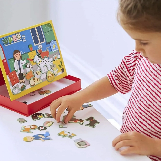 Szukasz idealnej zabawki dla małych miłośników zwierząt? Magnetyczna gra: Klinika weterynaryjna to doskonały wybór! Gra zawiera dwie magnetyczne tablice i 50 magnetycznych elementów, które pozwalają dzieciom tworzyć własne historie i sceny. Praktyczne składane pudełko ułatwia przechowywanie i szybkie sprzątanie elementów.