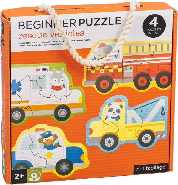 Uroczy zestaw czterech układanek z motywami pojazdów ratunkowych ucieszy małych budowniczych już od 2 lat. Każde mini puzzle ma inny poziom trudności (3–6 elementów), dzięki czemu dzieci postępują krok po kroku. Wykonane z makulaturowej tektury z recyklingu i zadrukowane tuszami roślinnymi. W zestawie praktyczne pudełko do przechowywania ułatwiające przenoszenie i odkładanie.