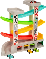 Tor wyścigowy zawiera różne poziomy i kolorowe samochodziki, co zapewnia zabawną i edukacyjną rozrywkę.