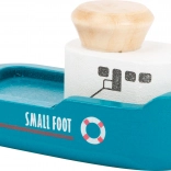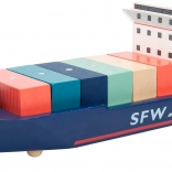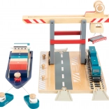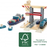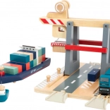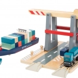 Ta przemyślana portowa konstrukcja zapewnia dzieciom realistyczną zabawę w logistykę: statek z dwoma holownikami jest gotowy do wypłynięcia, a dźwig przeładowuje kolorowe kontenery dzięki zintegrowanym magnesom. Solidne drewniane elementy i płynnie działające funkcje wspierają motorykę małą, wyobraźnię i cierpliwość.