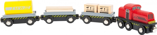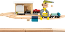 W zestawie jest 25 elementów torów, lokomotywa z wagonami oraz ładunek. Zestaw łatwo połączysz z większością drewnianych kolejek, aby stworzyć jeszcze większy świat zabawy.