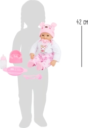 Bogaty zestaw akcesoriów obejmuje smoczek, butelkę, talerzyk ze sztućcami i nocnik w dopasowanych kolorach. Dzieci mogą ćwiczyć karmienie, przewijanie oraz nawyki higieniczne w formie zabawy w odgrywanie ról. Ubranka zaprojektowano z myślą o łatwym przebieraniu, dzięki czemu lalką wygodnie manipulują także małe rączki.