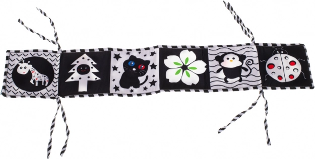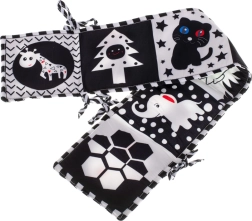 Kontrastowa książeczka sensoryczno-motoryczna, zaprojektowana jako ochraniacz do łóżeczka, jest doskonałym wyborem dla dzieci, które zaczynają odkrywać świat. Książeczka w formie harmonijki może być łatwo przymocowana do łóżeczka za pomocą sznurków, co zapewnia nie tylko zabawę, ale i bezpieczeństwo.