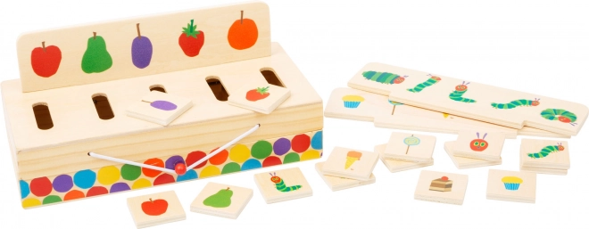 Design z lubianym motywem Very Hungry Caterpillar natychmiast przyciąga uwagę dzieci. Płytki i pokrywkę łatwo się obsługuje, a wytrzymałe drewniane wykonanie gwarantuje długą żywotność. Po zabawie wszystko po prostu zamykasz elastyczną taśmą – nic się nie rozsypie.