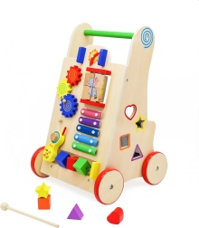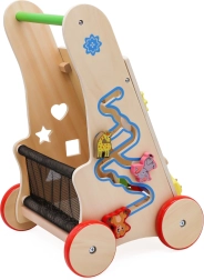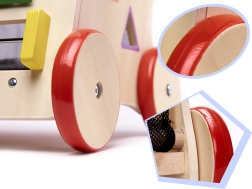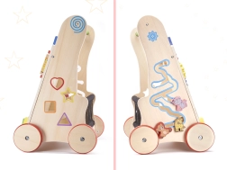 Wszystkie elementy chodzika są starannie wyszlifowane, aby chronić małe rączki przed drzazgami, oraz pomalowane nietoksycznymi, ekologicznymi farbami. Konstrukcja jest stabilna, z drewnianymi kołami pokrytymi gumą dla większego bezpieczeństwa. Chodzik ma po bokach także sorter kształtów z czterema kolorowymi klockami oraz labirynt z uroczymi zwierzątkami.