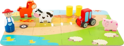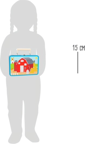 Świnka kwiczy, traktor buczy. Przenośna gra w pięknej walizeczce, dzieci mogą stworzyć własną farmę dzięki drewnianym figurkom w kształcie traktora, zwierząt domowych i farmera. Najpierw ułóż podstawę z puzzli, a potem możesz zacząć się bawić! Figurki bel siana dopełniają farmę. Zanurz się w wiejskim życiu i puść wodze fantazji. Walizeczka wykonana jest z wytrzymałego metalu, uchwyt z drewna, zamek można łatwo otworzyć. Odpowiednia do pokojów dziecięcych, bawialni... Główne cechy: zawiera 12 szt. puzzli oraz figurki farmera, traktora, świnki, krówki, konika i bele siana; praktyczne opakowanie – metalowa walizeczka z drewnianym uchwytem
