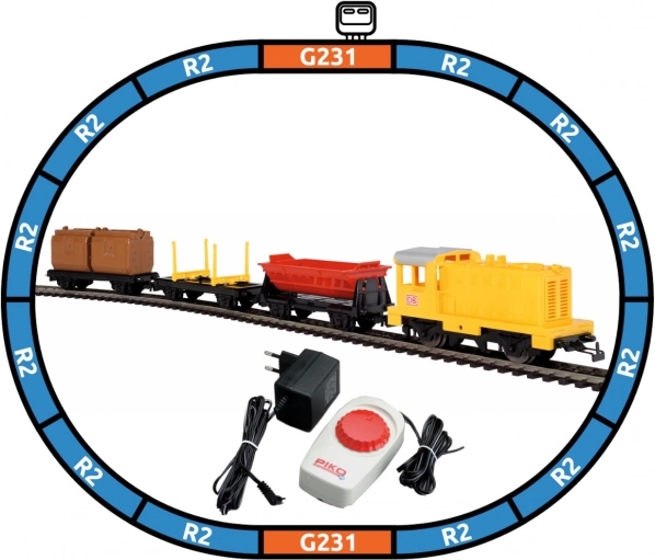 - Lokomotywa spalinowa DB (1×), wagony towarowe DB (3×), łuki R2 55212 (12×), proste G231 55201 (2×), zacisk zasilający 55270 (1×), analogowy kontroler z zasilaniem 55003 (1×)