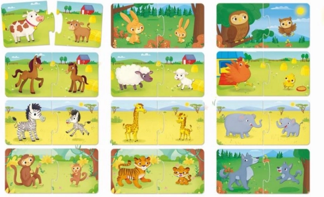 Zabawna gra edukacyjna dla najmłodszych: dopasuj zwierzęce mamy do ich młodych i rozwijaj myślenie dziecka. Zawiera 24 elementy, wykonane z bezpiecznych materiałów, odpowiednia dla dzieci od 1 roku. Świetny wybór, by wspierać logikę, małą motorykę i percepcję wzrokową.