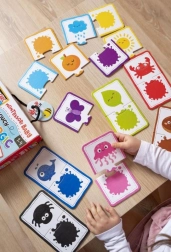 Zestaw kolorowych kart edukacyjnych zaprojektowany dla dzieci. Każda karta podzielona jest na dwie części z żywymi ilustracjami i pomaga dzieciom rozpoznawać kolory oraz kształty, idealna do gier edukacyjnych.