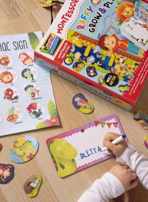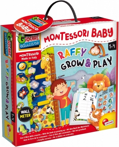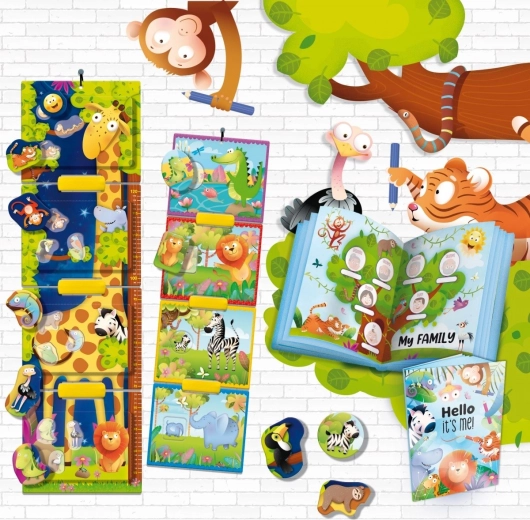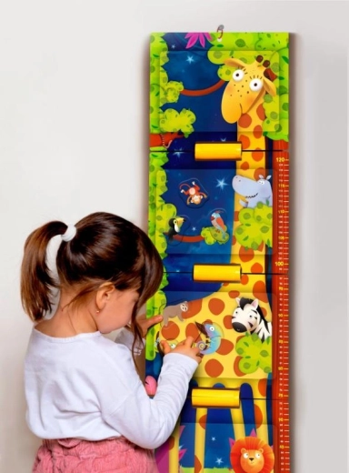 Ta radosna żyrafa jako miarka towarzyszy dziecku podczas jego wzrostu. Oryginalna miarka zawiera wiele gier logicznych. W zestawie znajduje się dziecięcy pamiętnik, który pozwoli zachować najważniejsze chwile z pierwszych lat życia Twojego maluszka. Pamiętnik zawiera 16 kart. Ten rodzaj gier Montessori pomaga dzieciom uczyć się w zabawny i skuteczny sposób, wykorzystując wszystkie zmysły. Odpowiednie dla dzieci od 1. roku życia.