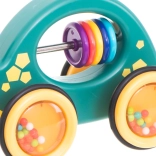 Koraliki wewnątrz kółek wydają przyjemny grzechoczący dźwięk przy każdym ruchu zabawki, stymulując słuch i zachęcając dzieci do aktywności.