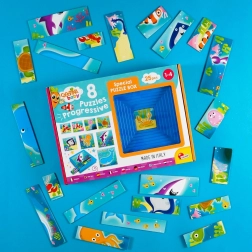 Progresywne puzzle CAROTINA Baby dają dzieciom radość z układania od samych początków. Każda z 8 układanek ma inną liczbę elementów i płynnie zwiększa poziom trudności, dzięki czemu dziecko naturalnie rozwija umiejętności bez frustracji. Tematyczne ilustracje z podwodnego świata zachęcają do odkrywania i zabawy.