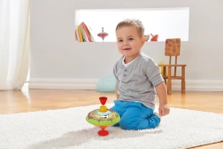 Kolorowy bąk do zabawy z motywem gospodarstwa stanie się ulubioną zabawką Twojego dziecka. Wystarczy pociągnąć i nacisnąć dźwignię, a bąk zacznie się kręcić i wydawać charakterystyczny dźwięk.