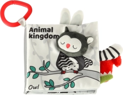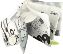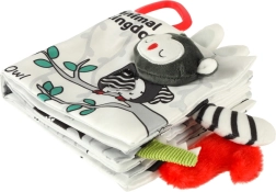 Z tą miękką książeczką w kontrastowych barwach Twoje dziecko wyruszy na odkrywanie świata zwierząt – od sowy przez małpkę i pandę po szopa, słonia, krokodyla czy zebrę. Czarno-białe i czerwone elementy wspierają wczesną stymulację wzrokową, a różne faktury oraz interaktywne elementy rozwijają małą motorykę i koordynację oko–ręka. Każda strona zawiera angielskie nazwy zwierząt, co w naturalny sposób wspiera pierwsze poznawanie słów.