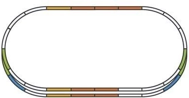 Zestaw E rozszerza podstawowy obwód o równoległy odcinek prosty i dwa rozjazdy łukowe, idealne do wyprzedzania i bardziej urozmaiconego ruchu.