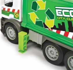 Tylną skrzynię łatwo podnieść i wysypać zawartość. Ruchome elementy wspierają motorykę i uczą dzieci zasad działania śmieciarki.
