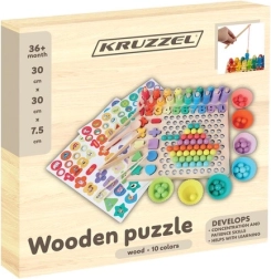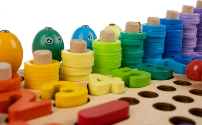 Zestaw zawiera dwustronne wzory, cyfry, symbole matematyczne oraz kolorowe kółeczka i kuleczki do budowania kompozycji. Dzięki drewnianej podstawie zabawka jest trwała i stabilna, a żywe kolory motywują do kreatywności, co ułatwia przyswajanie podstaw matematyki.